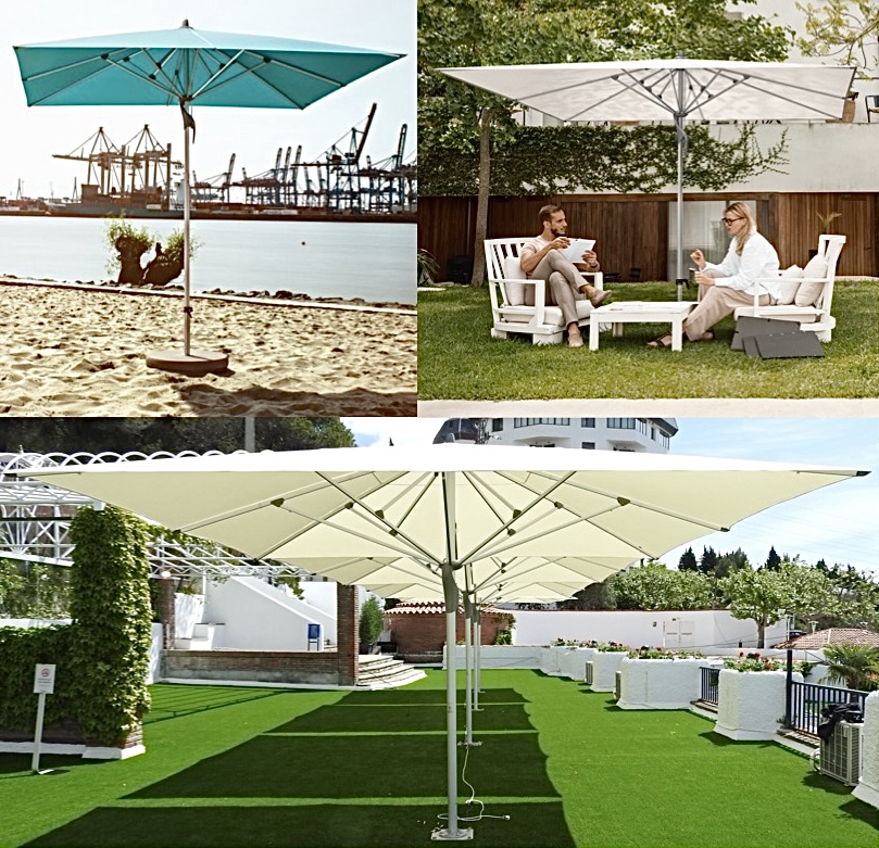 Diese Sonnenschirme für den Balkon oder die Dachterrasse können optional mit Rollensockel ausgestattet werden.